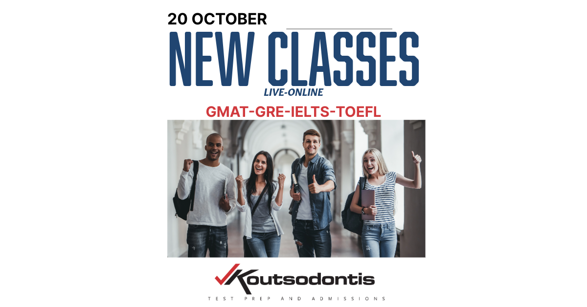 New classes of GMAT, GRE, IELTS and TOEFL start on Monday, 20 October. You can attend all courses either by physical or online presence . For more information and bookings please contact us on 210 6996015.