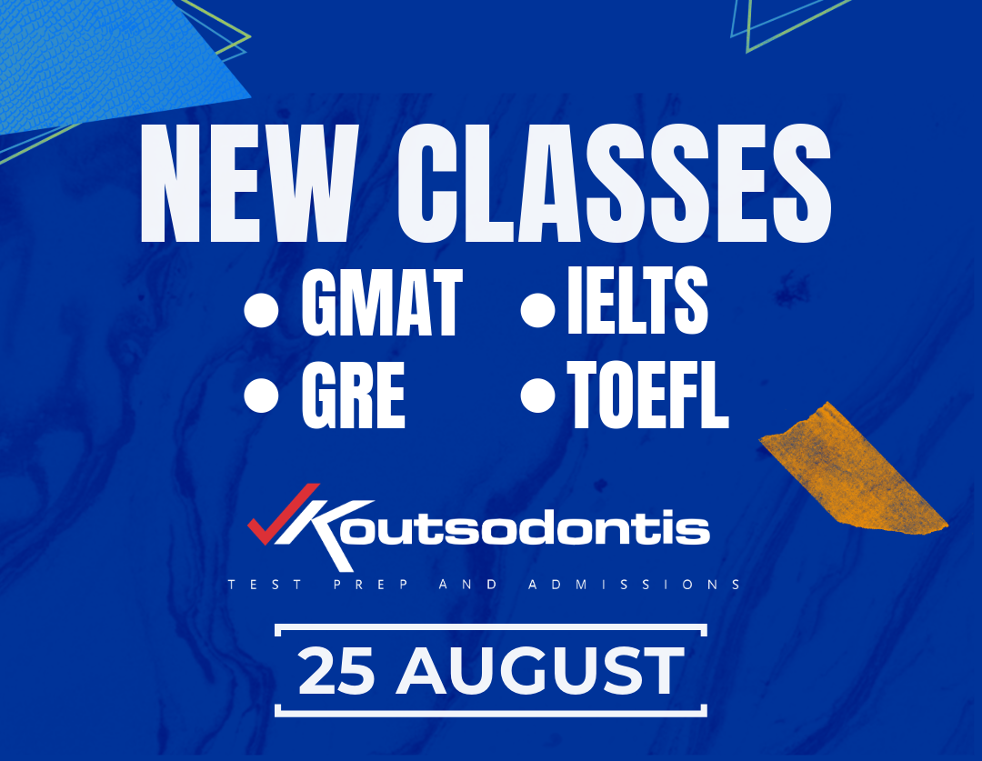 New classes of GMAT, GRE, IELTS and TOEFL start on Monday, 25 August. You can attend all courses either by physical or online presence . For more information and bookings please contact us on 210 6996015.